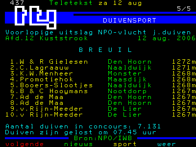 Een dag om niet gauw te vergeten, zaterdag 12 augustus 2006, de eerste keer dat het promotiehok op NOS-teletekst vermeld staat. Een schitterende 4e plaats van de wedstrijd vanuit Breuil le Vert tegen 7131 duiven.